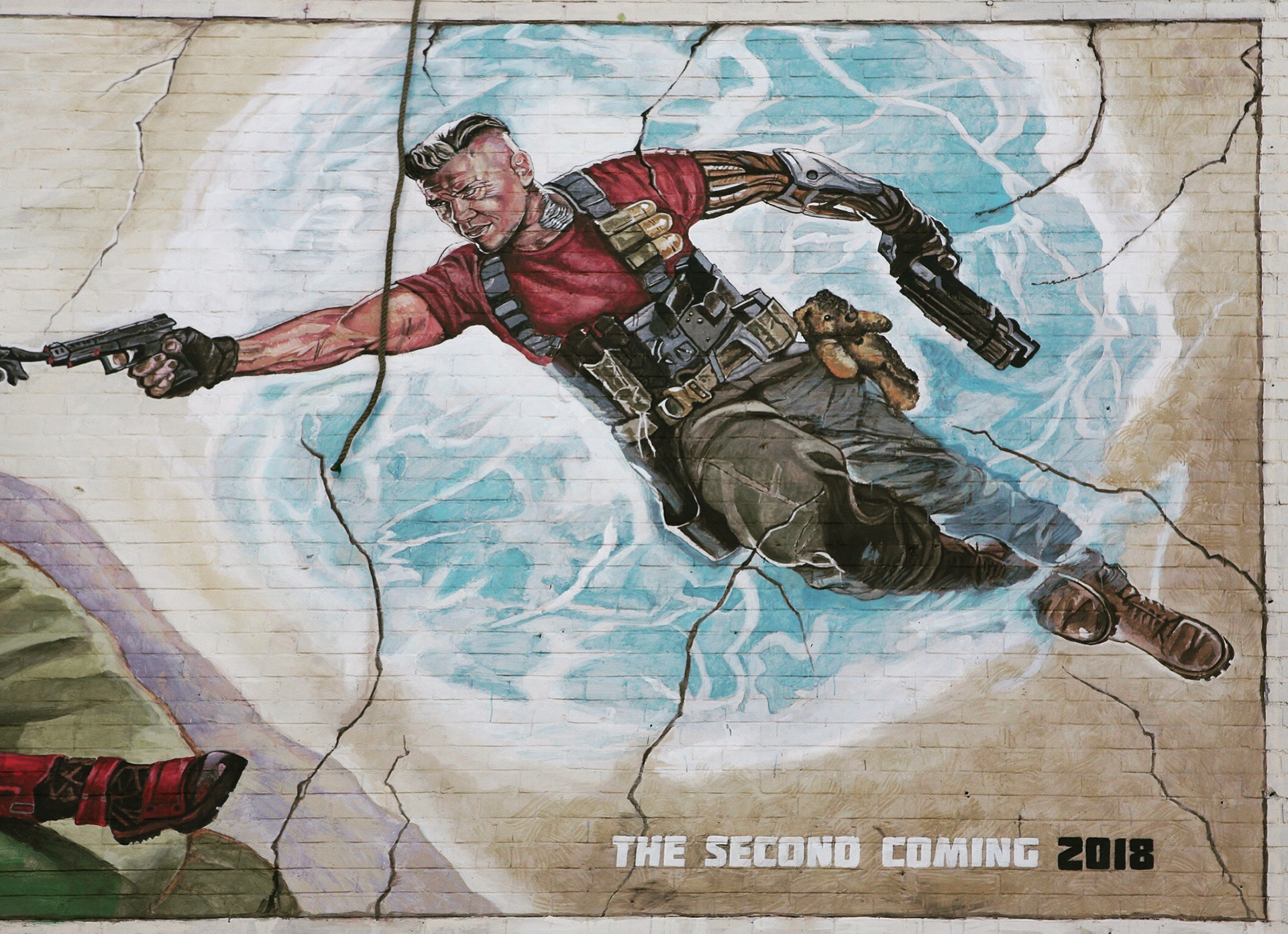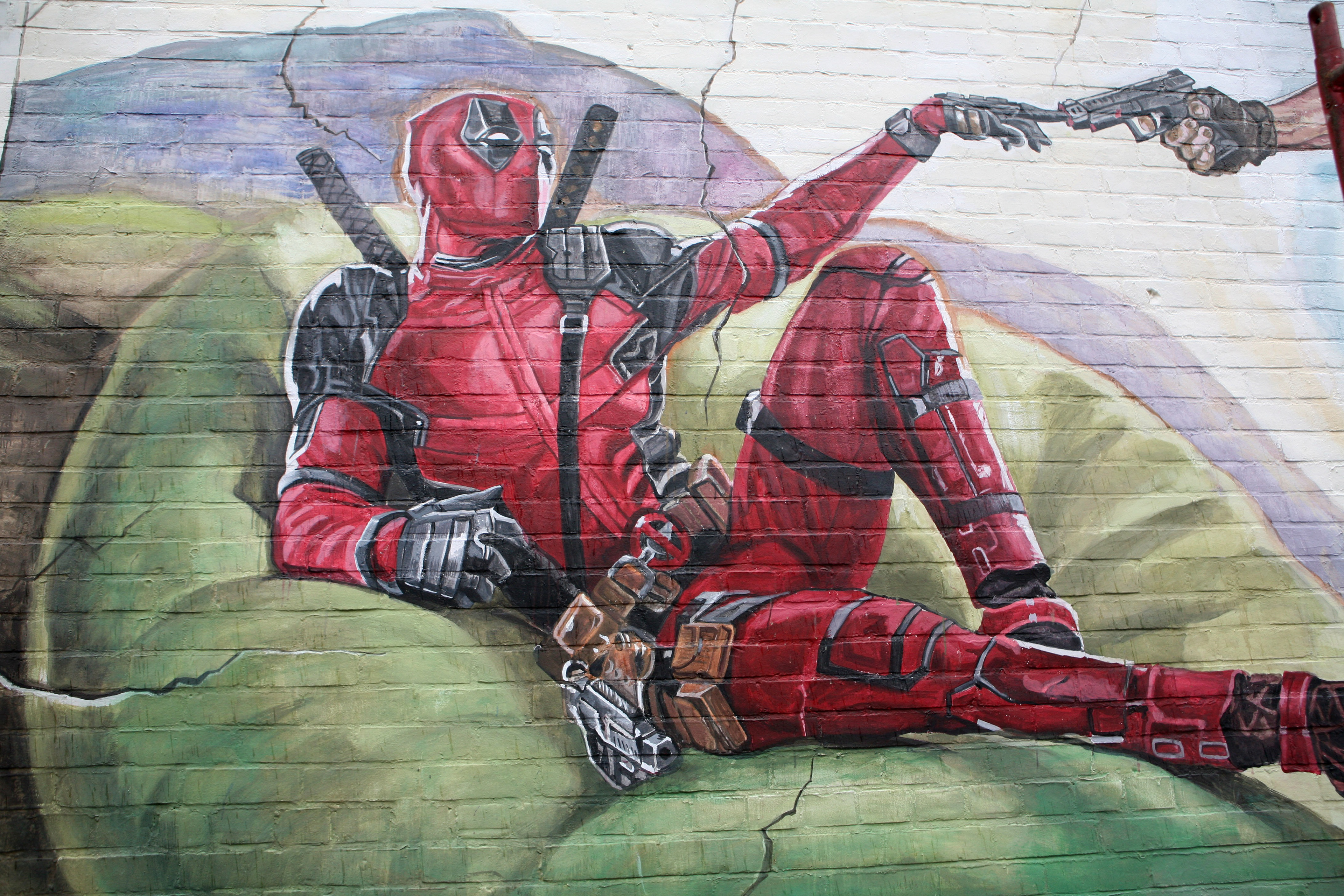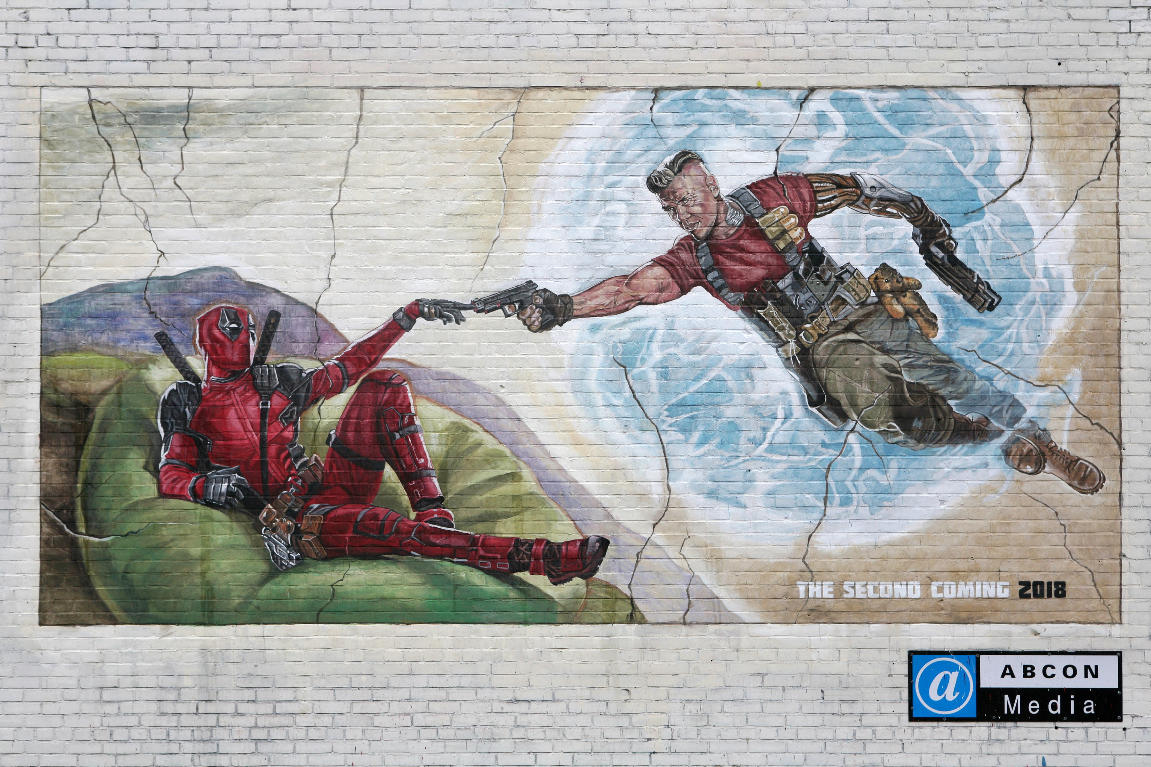 A brush painted Deadpool2 Homecoming Movie mural ad onto an ABCON Media billboard site. Richmond St W at John St. Toronto.