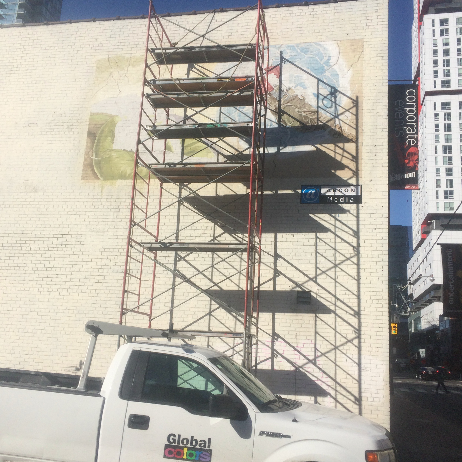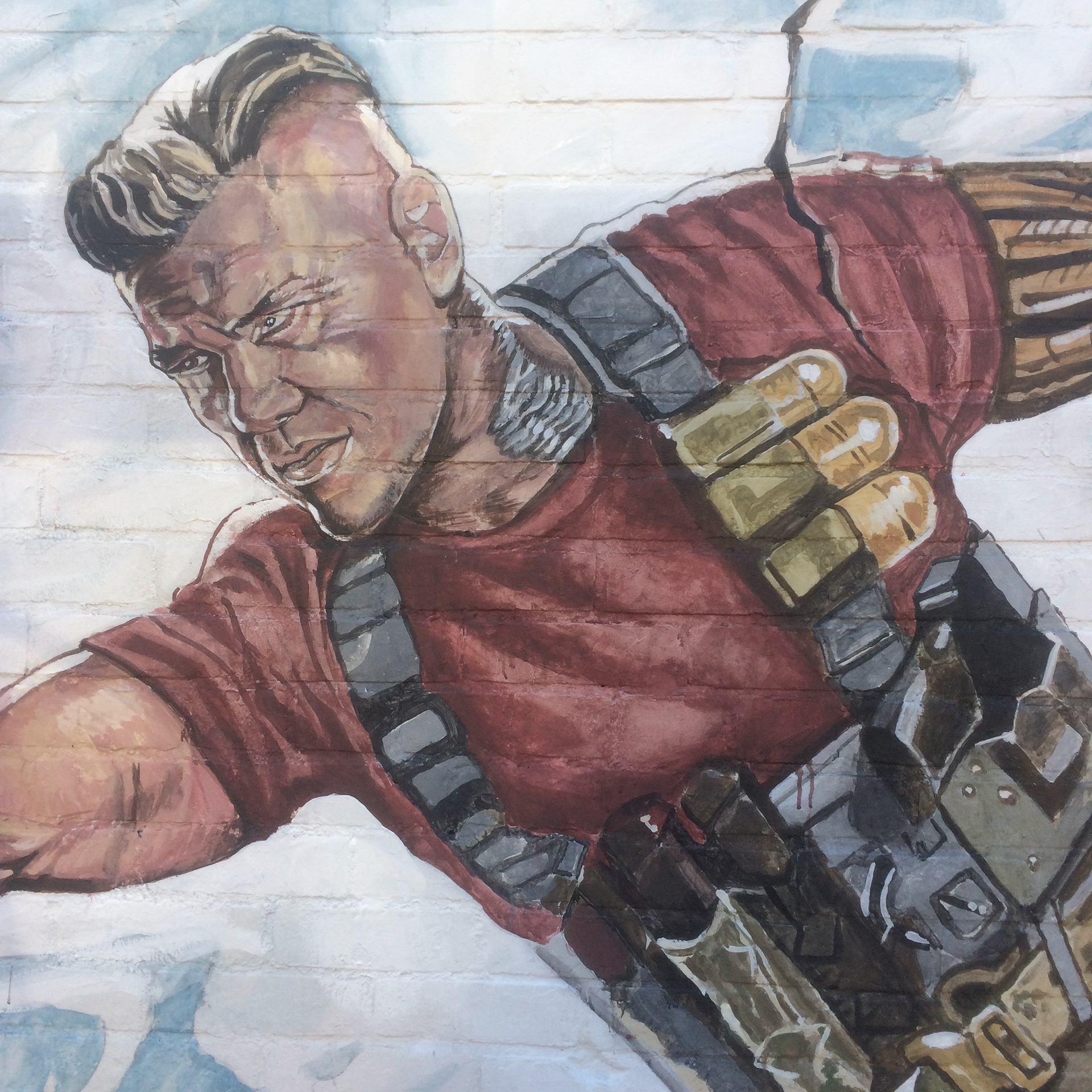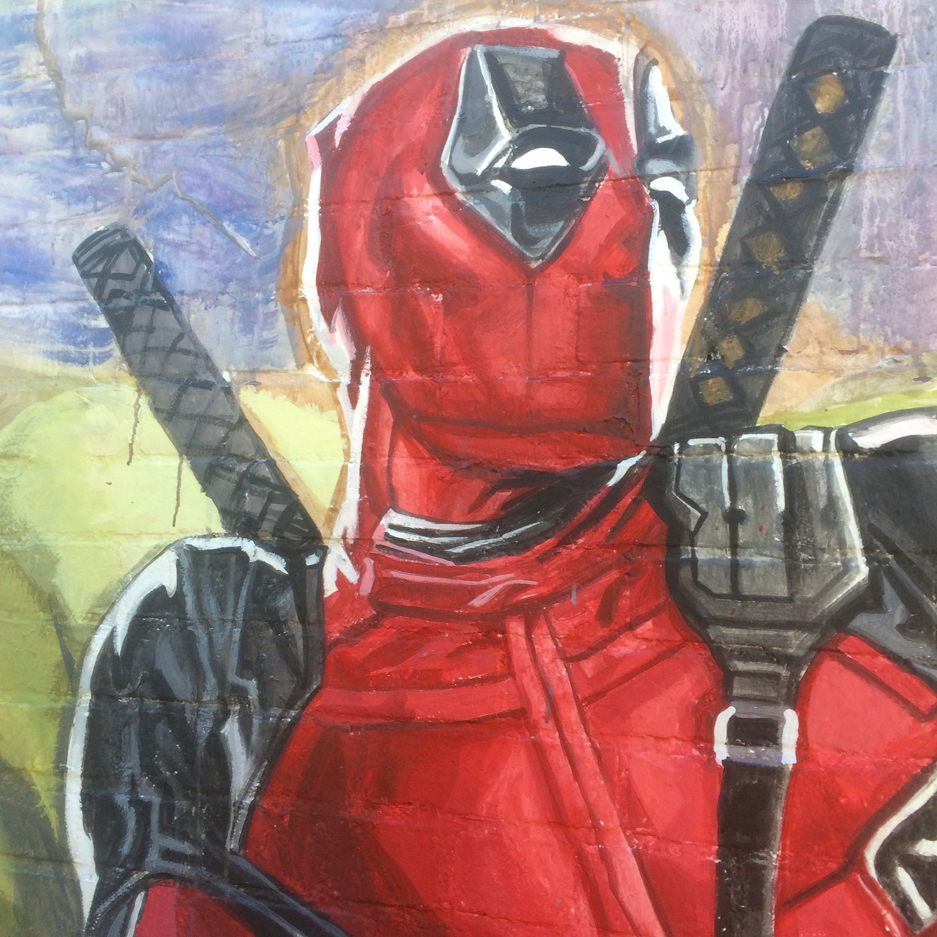 A brush painted Deadpool2 Homecoming Movie mural ad onto an ABCON Media billboard site. Richmond St W at John St. Toronto.