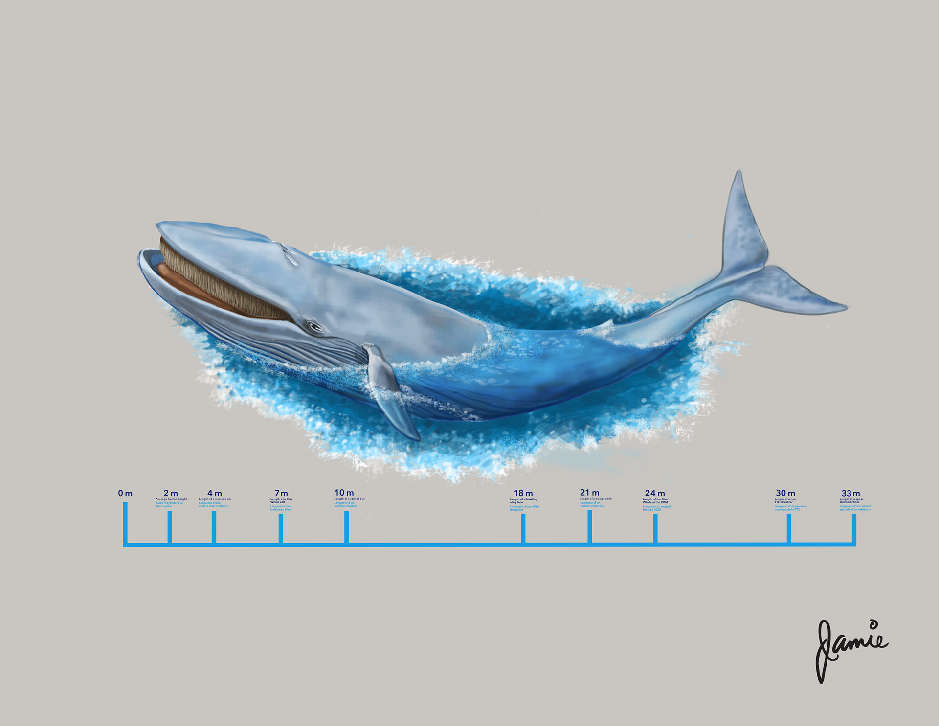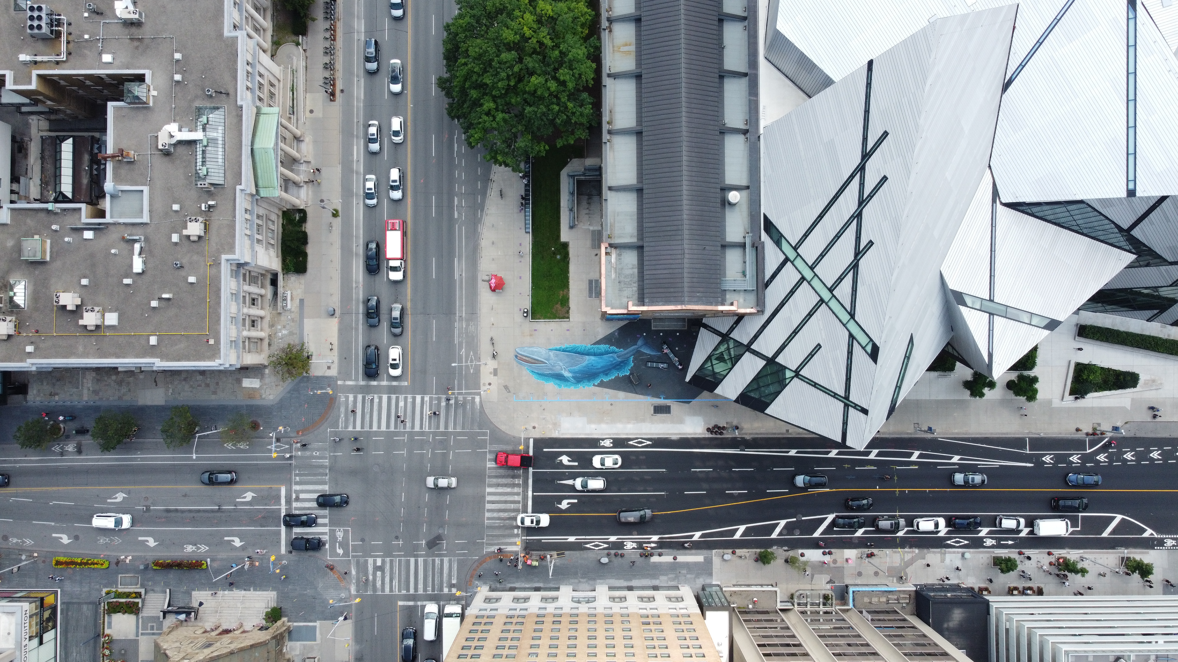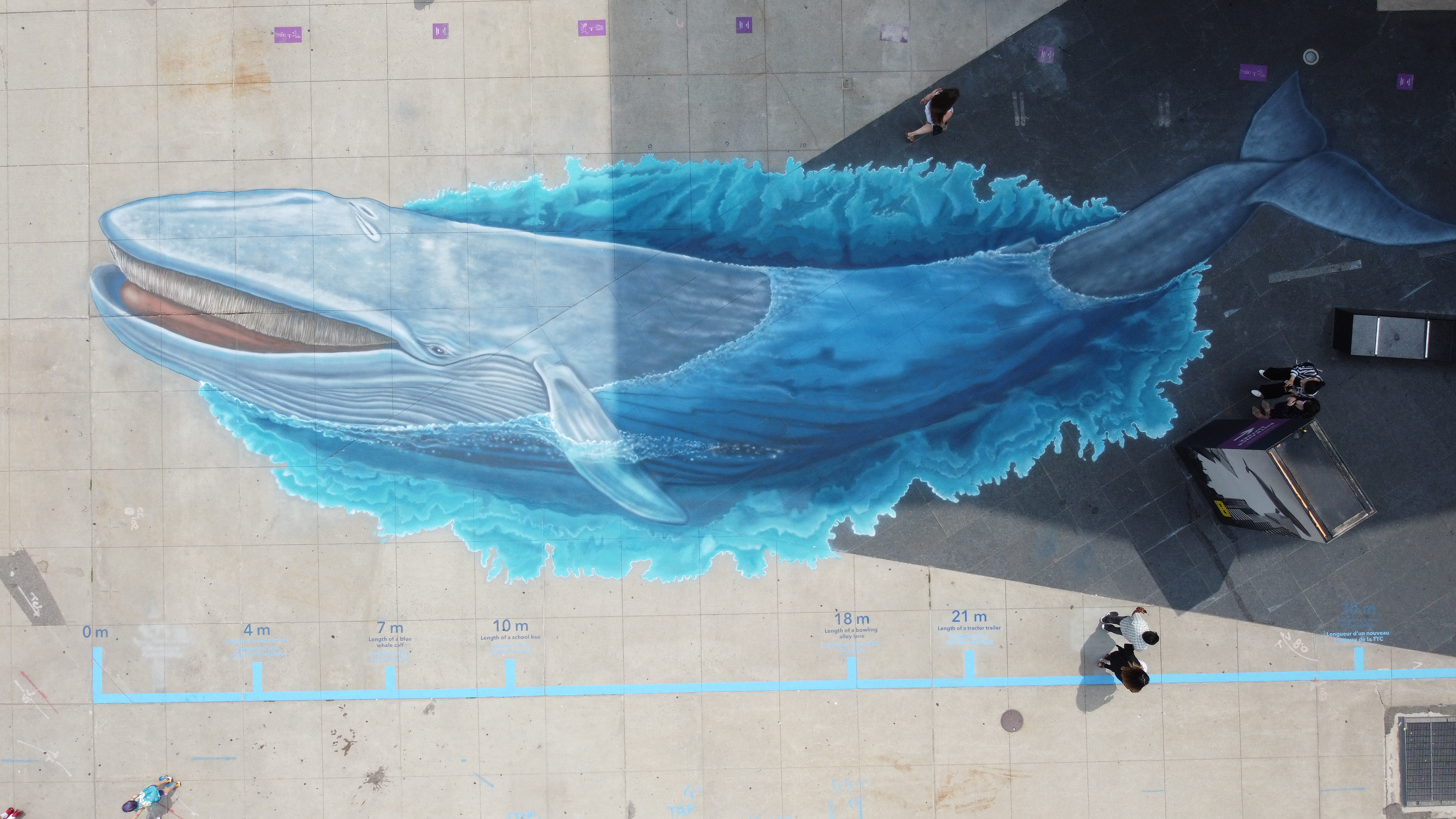 :ife sized 33m. Blue Whale painted with tempera paints directly onto the sidewalk on SW corner of Bloor St at University Avenue Toronto