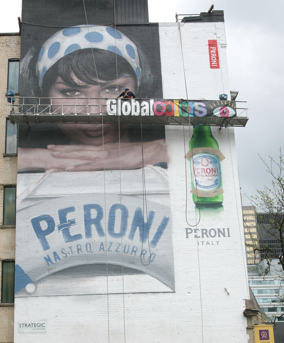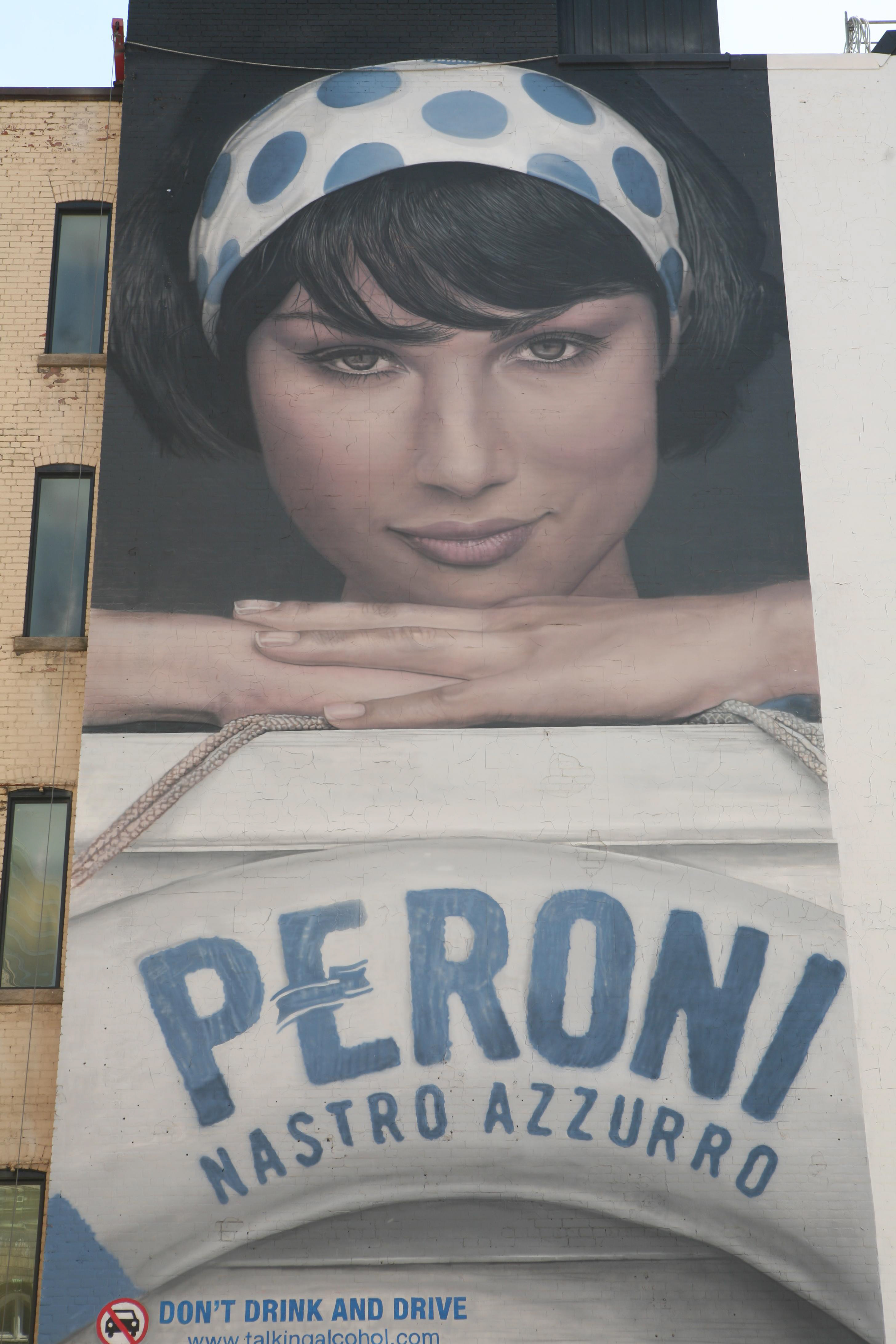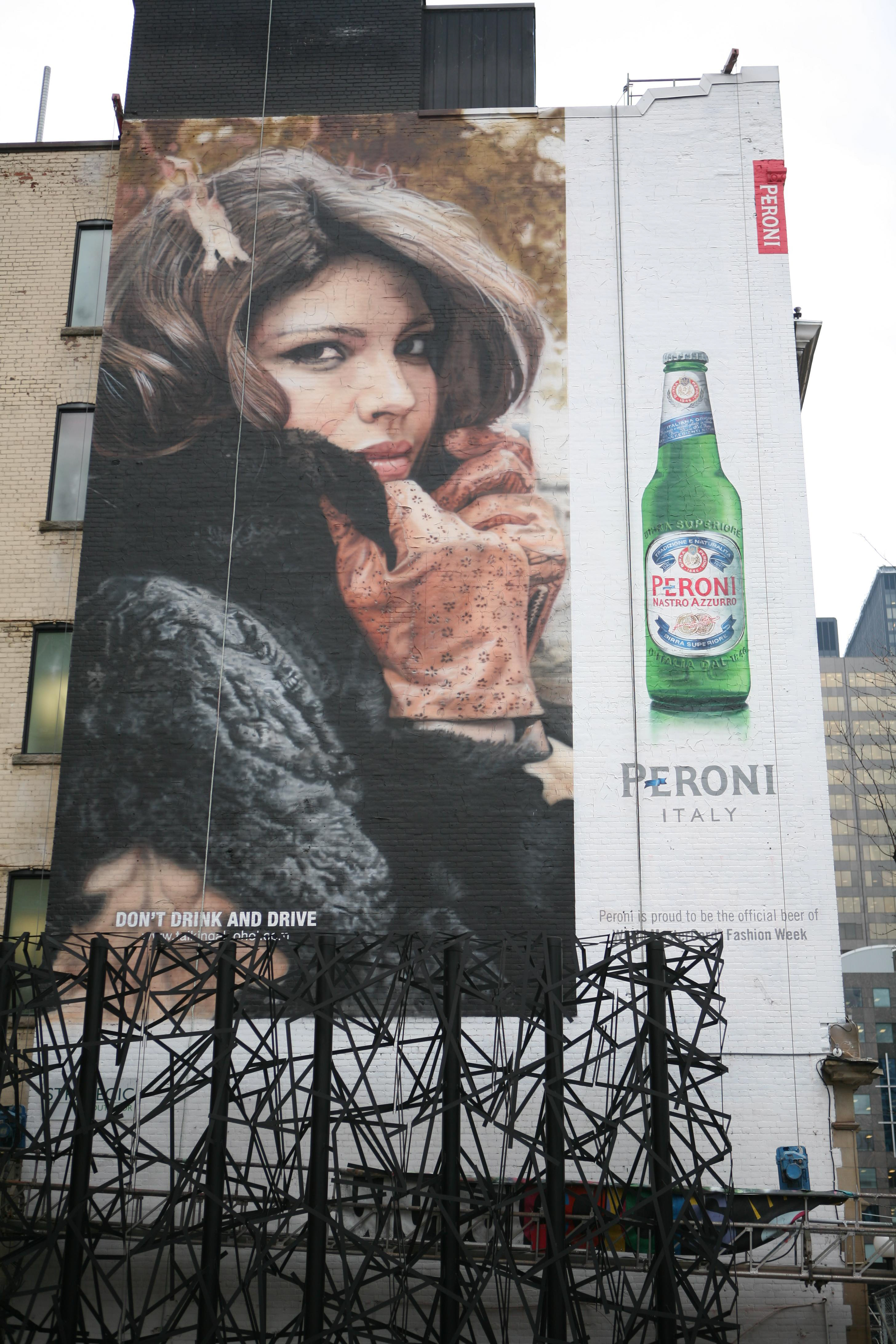 A series of three Peroni Beer Mural Ads done over a two year period. (Spring 2014- Winter 2015) Painted onto a Strategic Outdoor site at 220 King W. Toronto.
